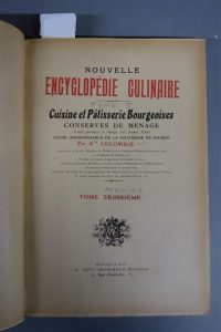 COLOMBIÉ (A.). NOUVELLE ENCYCLOPÉDIE CULINAIRE. CUISINE ET PÂTISSERIE BOURGEOISES. CONSERVE DE MÉNAGE. Traité pratique à l'usage des jeunes filles. Guide indispensable de la maîtresse de Maison. MEULAN, RÉTY, s. d. Un volume, grand in-8, de 367 pp., demireliure en chagrin cerise. Dos à 5 nerfs portant seulement le titre doré, tranches jaspées. Bon exemplaire.
