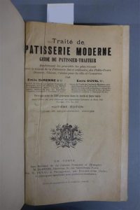 DARENNE (Émile) & DUVAL (Émile). TRAITÉ DE PÂTISSERIE MODERNE. Guide du pâtissier - traiteur renfermant les procédés les plus récents pour le travail de la pâtisserie fine et ordinaire, des petits fours, desserts glaces, cuisine pour la ville et conserves. PARIS, Aux bureaux de la Cuisine française, s. d. Un volume, in-8, de 744 pp., demi-reliure à coins en basane marbrée. Dos à multiples nerfs ou faux nerfs portant le titre doré. Quelques petites salissures éparses, le faux titre est manquant, quelques restaurations intérieures, en début et fin du volume.