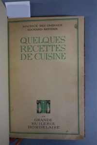 DES OMBIAUX (Maurice) & (Édouard) ROUZIER. QUELQUES RECETTES DE CUISINE. LA GRANDE HUILERIE BORDELAISE, s. d. (vers 1930 ?). Un volume, in-8, de 24 pp., demi-reliure en chagrin corbeaux. Dos lisse portant le titre doré en long, couverture conservée. Bon exemplaire.