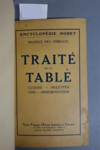 DES OMBIAUX (Maurice). TRAITÉ DE LA TABLE. CUISINE - RECETTES - VINS -ORNEMENTATION. PARIS, ENCYCLOPÉDIE RORET, s. d. (vers 1930). Un volume, petit in-8, de 253 pp., demi-reliure en basane bronze. Dos à 5 nerfs décoré à froid entre les nerfs, d'une roulette dorée sur les nerfs et portant le titre doré, couverture et dos conservés. Petite restauration sur la page de titre et le dernier feuillet de tables, mais reste un bon exemplaire.