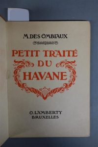 DES OMBIAUX (Maurice). PETIT TRAITÉ DU HAVANE. BRUXELLES, O. LAMBERTY, s. d. (1913). Un volume, petit in-8, broché de 105 pp., (1) f., couverture rempliée portant un décor noir et or sur fond havane.
