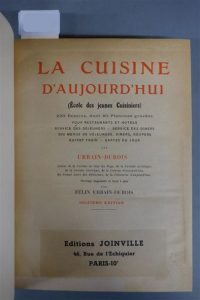 DUBOIS (Urbain). LA CUISINE D'AUJOURD'HUI (École des jeunes cuisiniers). Pour restaurants et hôtels - Service des déjeuners - Service des dîners. 200 menus de déjeuners, diners, soupers, buffet froid - Cartes du jour. PARIS, JOINVILLE, s. d. (1930 ). Un volume, in-8, de XX pp., 787 pp., demi-reliure en chagrin rouge. Dos à 5 nerfs portant le titre doré dans un encadrement de filets dorés, tranches jaspées. Bel exemplaire.