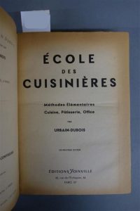 DUBOIS (Urbain). ÉCOLE DES CUISINIÈRES. Méthodes élémentaires. Cuisine, pâtisserie, office. PARIS, JOINVILLE, s. d. (1948 ?). Un volume, in-8, de CXXXII pp., 692 pp., demi-reliure en chagrin cerise. Dos à 5 nerfs orné de filets à froid ou dorés et portant le titre doré. Bordure des feuillets brunie. Bon exemplaire.