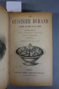 DURAND (C.). LE CUISINIER DURAND. Cuisine du midi et du nord. PARIS, GARNIER, s. d. (1871). Un volume, in-8, de XVI pp., 509 pp., (1) f., pleine reliure en toile bordeaux. Dos lisse portant une pièce de titre en feutrine noire, titre doré. Quelques feuillets en tête recollés.