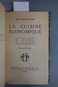 FRANK - PUAUX (Madame). LA CUISINE ÉCONOMIQUE. Soixante menus de déjeuners et de dîners, cent dix recettes. PARIS HACHETTE & Cie, s. d. (1916). Un volume, in-12, de VIII pp., 96 pp., demireliure moderne en chagrin marron. Dos à 5 nerfs décoré d'une roulette dorée en tête et en pied et portant le titre doré, couverture conservée. Bon exemplaire.