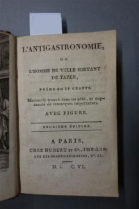[GOURIET (Jean Baptiste)]. L'ANTIGASTRONOMIE, OU L'HOMME DE VILLE SORTANT DE TABLE, poème en IV chants. Manuscrit trouvé dans un pâté et augmenté de remarques importantes. PARIS, HUBERT& Cie, 1806. Un volume, in-16, de 215 pp., pleine reliure en basane racinée. Dos lisse décoré et doré portant une pièce de titre en maroquin rouge, roulette dorée sur les coupes. Petites usures sur les coins, épidermures faibles.