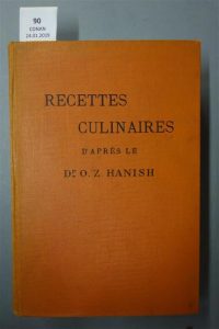 HANISH (Dr O. Z.). RECETTES CULINAIRES. Traduit de l'original et augmenté d'après les conférences de l'auteur par Carlos Bungé. PARIS, MAZDAZNAN, 1932. Un volume, in-8, de 418 pp., reliure cartonnée de l'éditeur habillée de percaline orangé. Titre en noir au dos et sur le premier plat.