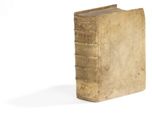d’un double encadrement de filets, de fleurons aux angles et d’un fer stylisé au centre, dos à nerfs orné de roulettes à froid, titre à l’encre, tranches mouchetées (reliure de l’époque). Belle et rare édition bilingue hébreu-latin, réunissant la grande et la petit chronique des Hébreux, connues respectivement sous les titres de Seder Olam Rabba (Grand Ordre du monde) et Seder Olam Zoutta (Petit Ordre du monde), traduites en latin et publiées par Jean Meyer (1652-1725), docteur en théologie et professeur de langues orientales à l’université de Hardewijk aux Pays-Bas. Les deux traités n’occupent que les 118 premières pages. Ils sont suivis des prolégomènes, de 3 dissertations, d’importantes notes et commentaires, couvrant les pages 231 à 1144, et de l’index. Il s’agit de l’une des meilleures éditions anciennes de ces chroniques, parue pour la première fois en 1699. Il semblerait que cette édition ne soit qu’une remise en vente de celle de 1699, avec simplement un titre de relais à la date de 1706. La collation est effectivement identique et l’on retrouve bien l’errata et le colophon daté de 1699 avec le nom de l’imprimeur : Albertus Sas à Hardewijk. Exemplaire très bien conservé dans sa première reliure présentant d’inévitables salissures. Manque les liens, un coin abîmé.