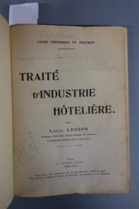 LEOSPO (Louis). TRAITÉ D'INDUSTRIE HÔTELIÈRE. Cours théorique et pratique. PARIS - NICE, ANDRAU, 1918. Un volume, in-8, de 391 pp., demi-reliure en vélin blanc. Dos lisse portant une pièce de titre en basane rouge. Bon exemplaire.