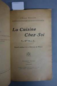 MADAME MARIE C... (Cancalon). LA CUISINE CHEZ SOI. Manuel pratique de la Maîtresse de Maison. Se trouve en dépôt chez Charles CANCALON, SAINT CHAMOND, 1927. Un volume, in-8, de 307 pp., demi-reliure en basane havane. Dos à 5 nerfs, roulette dorée sur les nerfs et titre doré, couverture et dos conservés. Trace de mouillure sur les 10 derniers feuillets, sinon bon exemplaire.