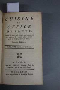 [MENON]. CUISINE ET OFFICE DE SANTÉ, propre à ceux qui vivent avec oeconomie & régime, & veulent allier le bon goût à la simplicité des mets. PARIS, LE CLERC, 1767. Un volume, grand in-12, de 416 pp., VIII pp., pleine reliure de l'époque en basane mouchetée. Dos à 5 nerfs cloisonné, fleuronné et doré portant une pièce de titre en maroquin rouge, filet doré sur les coupes, tranches rouges. Usures d'usage (coiffe supérieure arasée, épidermure au premier plat, coins émoussés), haut du feuillet de faux titre découpé pour faire disparaître un ex-libris.