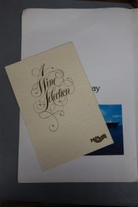 Avec la carte des vins et une carte postale, photographie du Norway," the worl's largets cruise, formerly S/S France...".