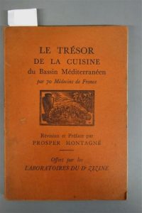 MONTAGNÉ (Prosper). LE TRÉSOR DE LA CUISINE DU BASSIN MÉDITERRANÉEN PAR 70 MÉDECIN DE FRANCE. Offert par les Laboratoires du Dr ZIZINE, s. d. Un volume, in-8, broché, de 127 pp. couverture imprimée et décorée (légèrement défraîchie).