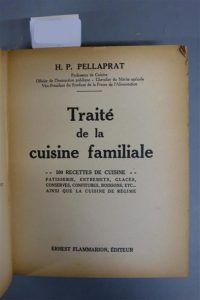PELLAPRAT (H. P.). TRAITÉ DE LA CUISINE FAMILIALE. PARIS, FLAMMARION, 1936. Un volume, in-8, de 297 pp., (1) f., reliure à la bradel, cartonnage de l'éditeur. Plats imprimés et décorés, titre en blanc sur le dos et le premier plat. Bon exemplaire.