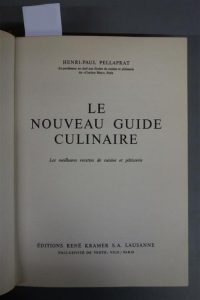 PELLAPRAT (Henri - Paul). LE NOUVEAU GUIDE CULINAIRE. Les meilleures recettes de cuisine et pâtisserie. LAUSANNE, KRAMER, 1966. Un volume, in-4, de 280 pp., reliure éditeur à la bradel habillée de toile rouge. Titre doré au dos et sur le premier plat, jaquette titrée et entièrement illustrée d'un décor personnalisé en couleurs. Bon exemplaire.