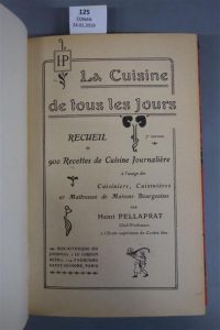 PELLAPRAT (Henri). LA CUISINE DE TOUS LES JOURS. Recueil de 900 recettes de cuisine journalière à l'usage des cuisiniers, cuisinières et maîtresses de maisons bougeoises. PARIS, LE CORDON BLEU, 1920. Un volume, in-8, de 240 pp., demi-reliure à la bradel en basane rouge. Dos décoré portant le titre doré