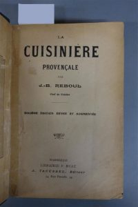 REBOUL (J. - B.). LA CUISINIÈRE PROVENÇALE. MARSEILLE, RUAT, s. d. Un volume, in-8, de 448 pp., demi-reliure en percaline bronze. Dos lisse décoré de filets dorés et portant le titre doré. Les charnières ont recollées ainsi que le frontispice.