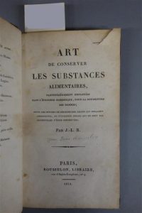 [ROUSSELON (Jean-Louis)]. ART DE CONSERVER LES SUBSTANCES ALIMENTAIRES, particulièrement employées dans l'économie domestique, pour la nourriture des hommes ; suivi des moyens de désinfecter celles qui seraient corrompues et d'utiliser celles qui ne sont pas susceptible d'être conservées. Par J. - L. R. PARIS, ROUSSELON, 1824. Un volume, in-12, de de VI pp., 171 pp., demi-reliure de l'époque en veau brun. Dos long orné à froid et doré portant le titre doré. Reliure habilement restaurée, petit manque de papier marginal sur le feuillet de titre.