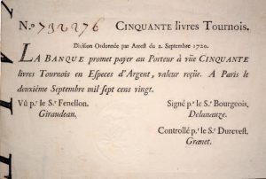 50 livres tournois, billet typographié du 2 Septembre 1720, n° 732276, signatures Giraudeau,