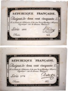 Assignats de 250 livres, grande marge. Création du 7 Vendémiaire de l'an II ( 28 Septembre 1793). Série 4916, n°303, signature Froidure.