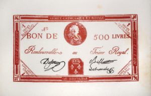 Bon de 50 livres (1794) armée catholique et royale de Bretagne. Reproduction ancienne extraite du livre A.Rouillé (1891) signature Dufour,