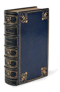 In-8 (177x110mm) plein maroquin bleu nuit, filets et motifs floraux dans les angles, dos à nerfs portant le titre doré et orné de motifs floraux, plats intérieurs du même maroquin ornés de filets d'encadrement et d'un motif central floral.
