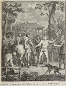 carte ; frontispice, (2 ff.), XXXIV, 383 pp. , 3 planches ; frontispice, (7 ff.), 218, 150 pp. , (17 ff.). Veau marbré, dos à nerfs orné, roulette dorée intérieure, tranches rouges (reliure de l’époque). Belle et célèbre édition donnée par Le Duchat, illustrée en premier tirage de 3 frontispices dont deux gravés par Bernard Picart (tome 1 et 3) et un dessiné et gravé par Folkema (tome 2), de 3 vignettes de titres par Picart, dont 2 identiques (tomes 1 et 3), de 3 gravures topographiques dépliantes non signées, de la figure de la Bouteille, d’un portrait de Rabelais gravé par Tanjé, de 12 en-têtes et 12 culs-de-lampe par Picart et de 12 superbes planches gravées par Bernaerts, Folkema et Tanjé d’après Du Bourg. Reliures frottées, quelques taches sur les plats, plusieurs manques de cuir dus à des travaux de vers, coins émoussés. Plusieurs planches roussies comme souvent, rousseurs éparses. Planche face à la page 300 dans le second volume légèrement coupée.