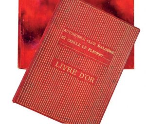 Livre d'or. 1928-1932 1 volume in-4, maroquin rouge, plats et dos ornés de filets dorés, titre à l'or sur le 1er plat, encadrement intérieur du même maroquin orné de roulettes et filets dorés, reliure d'époque. (A. Pisani à Alger), étui cartonné rouge.