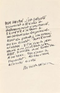 [...] C'est fait, votre manuscrit a été remis et chaleureusement recommandé. Il le mérite d'ailleurs. Je vous parlerai de tout cela quand je vous reverrai et ce sera bientôt. Mon travail m'absorbe. Je l'ai dans la peau comme une maitresse qu'on déteste. Il me tue et m'empêche de me raser [...]