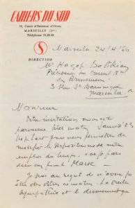 Tapuscrit, 3 pages et ½ in-4, signé au crayon rédigé en hommage au créateur des Cahiers du Sud.