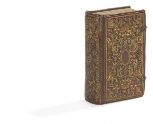 à la fanfare formé de compartiments incrustés et mosaïqués de maroquin havane, vert olive et vert foncé, ornés de motifs de feuillage, de volutes, de fleurettes, et soulignés d’un double ou d’un simple filet doré, filet doré sur les coupes, tranches dorées, restes d’attaches (reliure du début du XVIIe siècle). Second tome seul de la Description de la Grèce du géographe et voyageur de l’Antiquité Pausanias, publiée et traduite du grec en latin par l’humaniste italien Romolo Amaseo (1489-1552). Il contient les livres 6 à 10 concernant successivement l’Élide (seconde partie), l’Achaïe, l’Arcadie, la Béotie et la Phocide. PRÉCIEUSE RELIURE MOSAÏQUÉE À LA FANFARE DU DÉBUT DU XVIIE SIÈCLE, constituant l’un des rares exemples d’une mosaïque véritable, dont le décor est composé de peaux découpées, ajustées et incrustées à la couvrure qui est elle-même découpée pour recevoir l’incrustation. Chaque incrustation forme un compartiment, ici de maroquin havane, vert olive et vert foncé, orné d’un motif doré (feuillage, volute, fleuron, fleurette, etc.) proposant ainsi un décor foisonnant typique des productions de ce genre au tournant du siècle. Cette technique de l’incrustation fut très rapidement abandonnée en raison notamment de la difficulté de réalisation mais également de la fragilité des reliures. Ce specimen appartient à un groupe de 6 ouvrages dont 4 ont été étudiés par Paul Culot qui ne connaissait pas celui-ci, tous utilisant la même technique et les mêmes fers, provenant d’un même atelier qui n’a hélas pas été identifié à ce jour. Les cinq autres ouvrages sont : Psalmorum Liber. Prophetae. Anvers, 1569. 2 volumes in- 16 (vente Esmerian, 1972, n° 101, avec reproduction). - Ciceron. Ad Q[uitum] fratrem. Dialogi tres de oratore. Lyon, 1588 (vente Wittock, III, octobre 2005, n° 13, avec reproduction). - Quinte-Curce. De Rebus gestis Alexandri Magni historia. Lyon, 1597 (Vente Rahir, I, 1930, n° 64, avec reproduction). - Claudien. Opera. Lyon, 1605 (catalogue Fairfax Murray, n° 95). - Tite-Live. Latinæ historiæ principis, decas quatras. Tournon, 1605 (vente Coupel de Lude, 2009, n° 39, avec reproduction). Exemplaire très bien conservé, si ce n’est qu’il manque les liens de cuir des attaches. Mouillures claires, marge haute courte. Signatures anciennes sur le titre et à la fin.