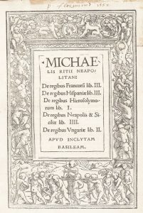 RICCIO (Michele). De regibus Francoru(m) lib. III. De regibus Hispaniæ lib. III. De regibus Hierosolymorum lib. I. De regibus Neapolis & Siciliæ lib. IIII. De regibus Vngariæ lib. II. Bâle : Johann Froben, 1517. — In- 4, 85 ff., (5 ff.)....
