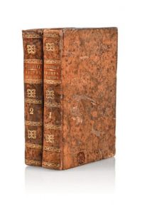 Ex libris héraldique du Marchese Nicolo Francesco de Mari. Reliure de l'époque. Petite fente à une coiffe, mouillure claire à la fin du tome I. Ont été ajoutés, au tome I: une figure allégorique, un portrait d'un doge de Gênes; au tome II: une carte en couleurs de la République de Gênes, le portrait de Pagano Doria, général, 1354. Une tache p. 14 du T 1, mouillure claire en fin de vol du T 1 [T. 1: dalla fondazione al 1700; t. 2:
