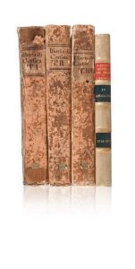 -1, viii - 345 - 1, iv - 324, iv - 360 p.): sans la carte dépliante; in-4°, cartonnage muet ocre d'attente de l'époque pour les 3 premiers vol., demi-vélin ivoire, dos à nerfs, pièces de titre et de tomaison rouge et verte pour le vol. 4. Reliure et cartonnage de l'époque.