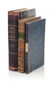 - Paris: impr. de Fain et Thunot, 1844. - 146 p.; in-8, demi-basane bleu nuit, dos lisse orné de filets dorés. Reliure de l'époque. Mouillure claire au bas du vol.; J. A..Garnier-Dubourneuf a procédé à la traduction en français de l'introduction de Gregorj dans les Statuti civili. Extrait de la Revue Étrangère et Française de Législation, de Jurisprudence et d'Économie politique (Paris). - T. X (1843). À la suite, a été reliée une plaquette de 16 p. sur l'eau minérale ferrugineuse acidulée d'Orezza (Corse). Imprimée à
