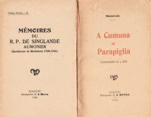 *A cumuna di Parapiglia. Cummedia in 4 atti. - Ajaccio: Stamparia di A Muvra, 1926. - 98 p.; in-12°, broché, couv. imprimée. Envoi autographe signé de l'auteur à L. Carbone. Nous joignons: Singlande, de (R.P.). - Mémoires du...