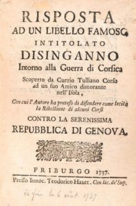 *Risposta ad un libello famoso intitolato Disinganno intorno alla guerra di Corsica scoperto da Curzio Tulliano Corso ad un suo amico dimorante nell'isola, con cui l'Autore ha preteso di difendere come lecita la ribellione di alcuni corsi contro la Serenissima Repubblica di Genova. - Friburgo: Innoc. Teodorico Hautt, 1737. - 271 p.; in-8°, cartonnage muet d'attente de l'époque. Le premier cahier a été remonté ou renforcé. Ex. en bonne condition.
