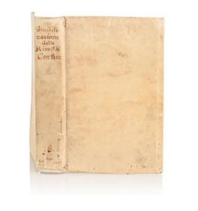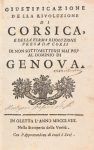 -Giustificazione della rivoluzione di Corsica, e della ferma risoluzione presa da' corsi di non sottomettersi mai più al dominio di Genova. - Oletta: Nella stamperia della Verità. Con l'approvazione di tutti i Savj, 1758. - [2], 408 p.; in-8°, vélin ivoire, tranches rouges. Reliure de l'époque en belle condition. Ex libris héraldique Steph. Rossi, également manuscrit du même au titre. Bel exemplaire.