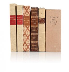 Voir Paoli p. 311-312; 1759, 2 parties en un fort volume, Cartonnage muet moderne; 1768, cartonnage crème moderne, voir Réf. à la Corse; 1769, cartonnage crème moderne, voir Réf. à la Corse; 1795, demi veau brun à coins, dos richement orné et doré, reliure de l'époque. Soit un ensemble de 7 années reliées en 6 volumes en bonne condition.