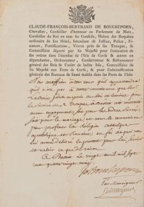 Corse, intendant. Certificat, Bastia le 26 avril 1783, 1 p. in-folio, En-tête imprimé à ses armes et titres, cachet de cire rouge armorié. Certificat en faveur de Jean Joseph Tabareau attestant qu'il n'a contracté aucun engagement de mariage ni qu'il a été admis aux ordres sacrés... nous le reconnaissons pour être de la religion catholique, apostolique et