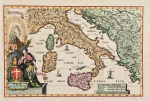 -Italiae plurima pia foca Delparentis... 1699. 23,5 x 35,5, aquarellée. Carte de l'Italie, Sicile, Corse et Sardaigne, Macédoine. Cette carte datée de 1699, sera en fait publiée dans l'Atlas Novus à Munich vers 1702-1710. Son travail est caractérisé par un riche décor à sujet chrétien, comme c'est le cas ici. Belle carte, très décorative.