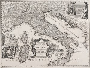 Halma, François. -Niewe kaart von Italien... 1704. 50 x 65 Carte richement décorée de 3 cartouches.