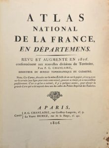 -Atlas National de la France en Départemens. Revu et augmenté en 1806, conformément aux nouvelles divisions du territoire... Paris, Chanlaire, Vve Dumez, 1806. Fort volume (61 x 47 cm) en demi-basane blonde, dos lisse, pièce de titre verte. Les cartes sont au format éléphant, montées sur onglet et pliées en deux. Les limites des arrondissements et des cantons sont mises en couleurs. Quelques rousseurs à certaines cartes, déchirures avec manques aux cartes suivantes: