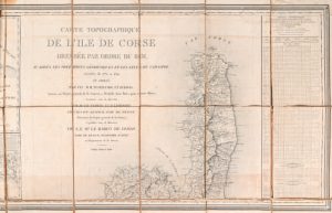 Pierre Jacotin, ingénieur et cartographe français, d'après le levé de l'île réalisé entre 1770 et 1791. Deux cartons, carte générale et carte des triangles.; au bas de la carte se trouvent un tableau des arrondissements, cantons, communes ou mairies du département de la Corse avec le nombre des villes et villages, leur population et la superficie de leurs territoires en anciennes et en nouvelles mesures, un tableau des règles de prononciation pour les noms de la carte, un autre contenant la signification française de plusieurs noms...