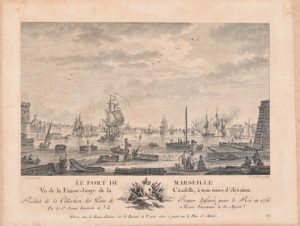 -XVIIIe, relatives à Marseille, dont vue de Münster, ca 1600; F. Cary, 1781; vues de la rade, du port, plans de la ville, deux vues d'optique un peu défraichies (Cours de Marseille, Hôtel de ville et port), plan d'Aix, 9 vues tirées des Plans et Profilz des principales villes de la Province... Gouvernement du Dauphiné, Desnos 1771. Au total 40 pièces diverses.