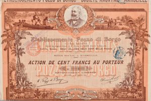 Établissements Pozzo di Borgo. 3 actions de cent francs au porteur. 23 x 32, Illustrée.