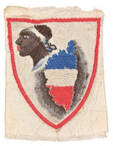[Irrédentisme]. - Insigne en tissu, 6 x 5 cm avec la Corse aux couleurs françaises et la tête de maure, dans un encadrement rouge. C'est très vraisemblablement un insigne patriotique de production française réalisé probablement à la suite de revendications irrédentistes sur la Corse de novembre 1938.