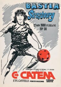 Sporting Club de Bastia. Ensemble de 3 affiches de format 63 x 43 environ à vue, de la saison 1980, 1983, annonçant la tenue des matches à Furiani. L'une d'entre elles porte la signature de