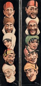 Sud de la Méditerranée, fusain, aquarelles, huiles sur bois ou papier, formats divers. Une partie des caricatures de ce peintre d'origine corse, a figuré dans l'exposition Un rêve d'Orient, des Corses en