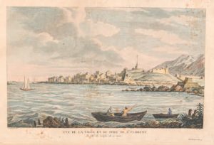 D'Aubigny. Vue de la ville et port de Saint Florent. Gravure aquarellée, 25 x 36,5 à la cuvette, sous …